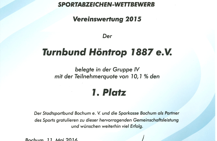 Damit erreichte der Verein in der Gruppe IV der größten Vereine (mindestens 750 Mitglieder) zum neunten (9!) Mal in Folge den ersten Platz beim Wettbwerb des Stadtsportbundes, der von der Sparkasse Bochum finanziert wird. Der Verein erhält als Sieger eine Prämie, sowie eine Bonuszahlung für jedes abgelegte Sportabzeichen.
