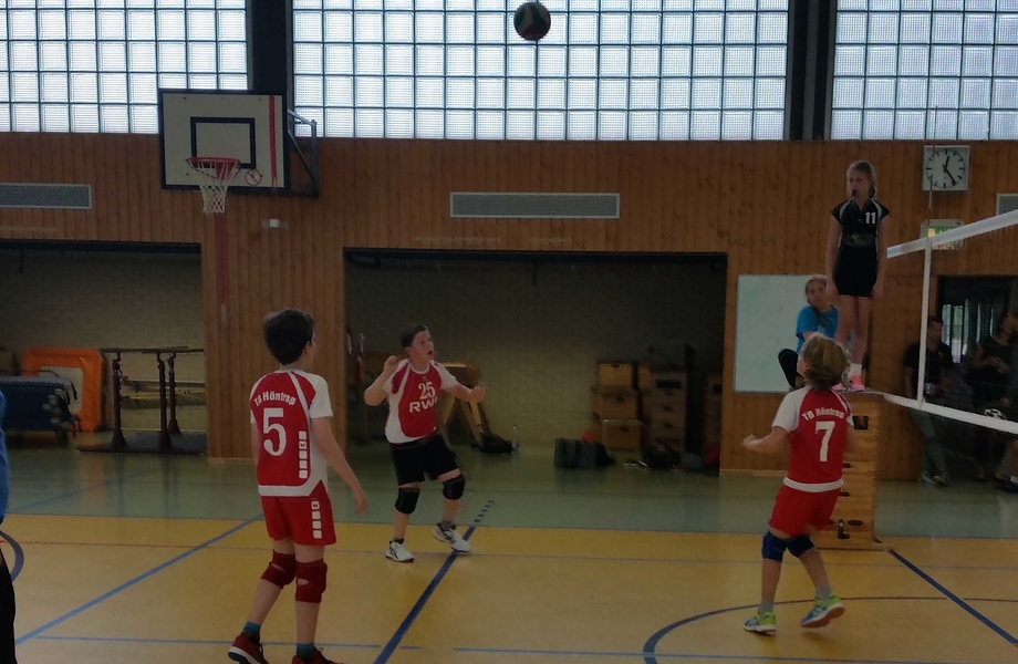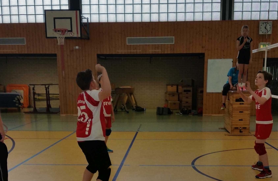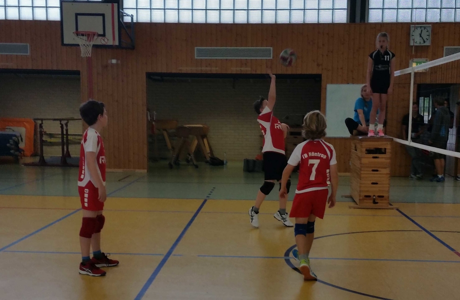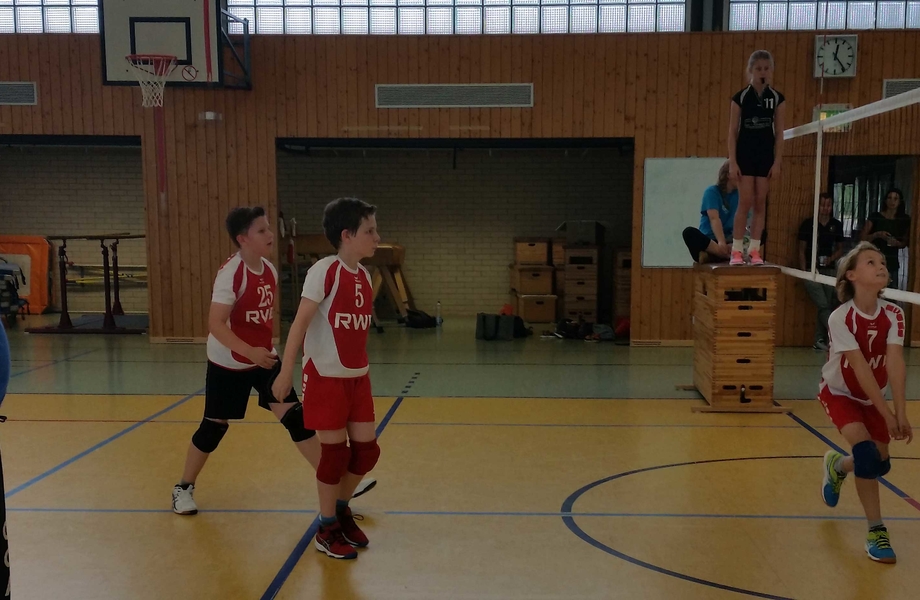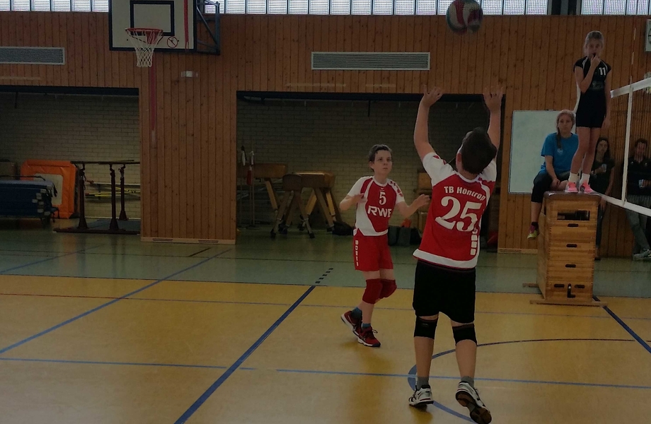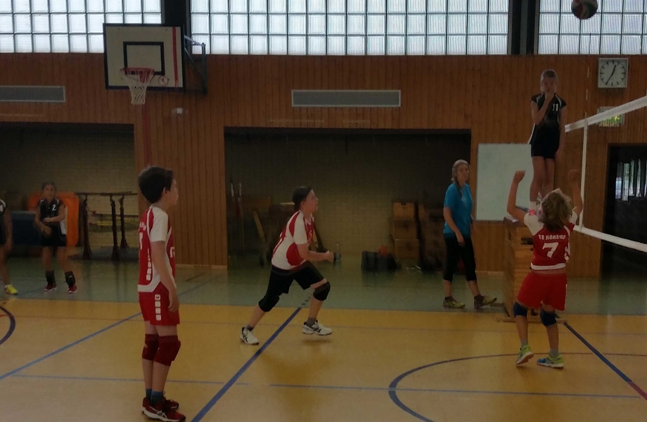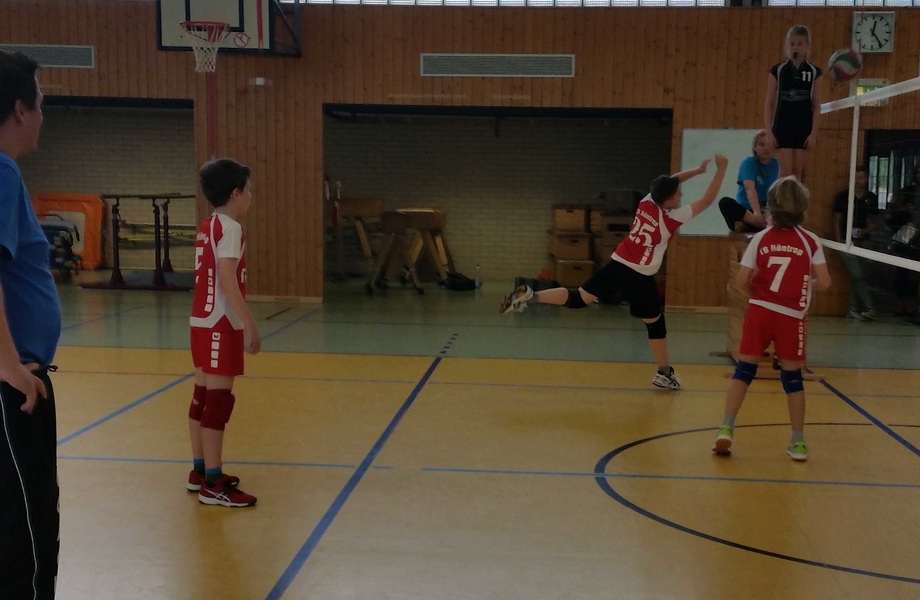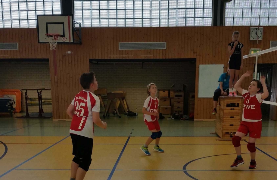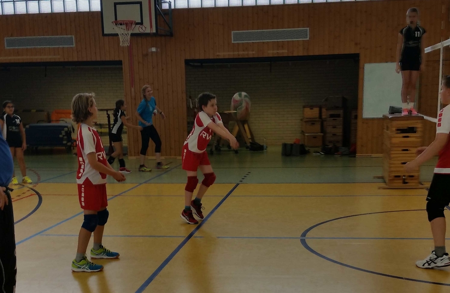 Erster Gegner waren die Mädchen vom TV Vogelsang, die in der Vorsaison in der U12 immerhin elfter bei den Westdeutschen Meisterschaften geworden sind. Mika, Tom und Bjarne lieferten eines ihrer besten Spiele ab und brachten, nach einer Verunsicherung zu Satzbeginn (1:4), den Favoriten immer wieder in Bedrängnis. Am Ende setzten sich die Mädchen aber aufgrund der insgesamt besseren Grundtechnik im Aufbauspiel mit 22:25 durch.