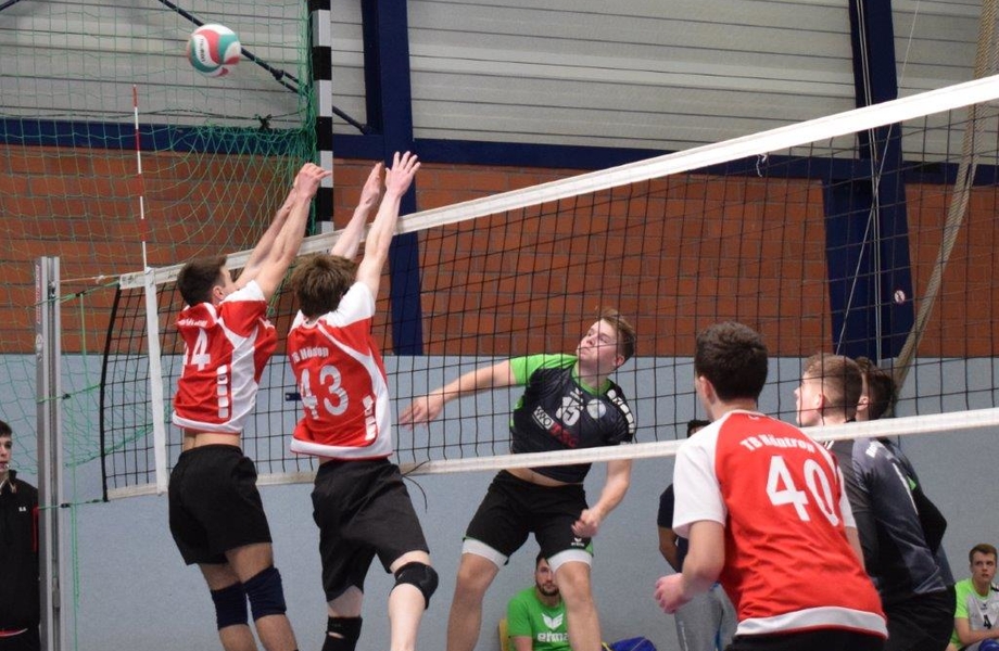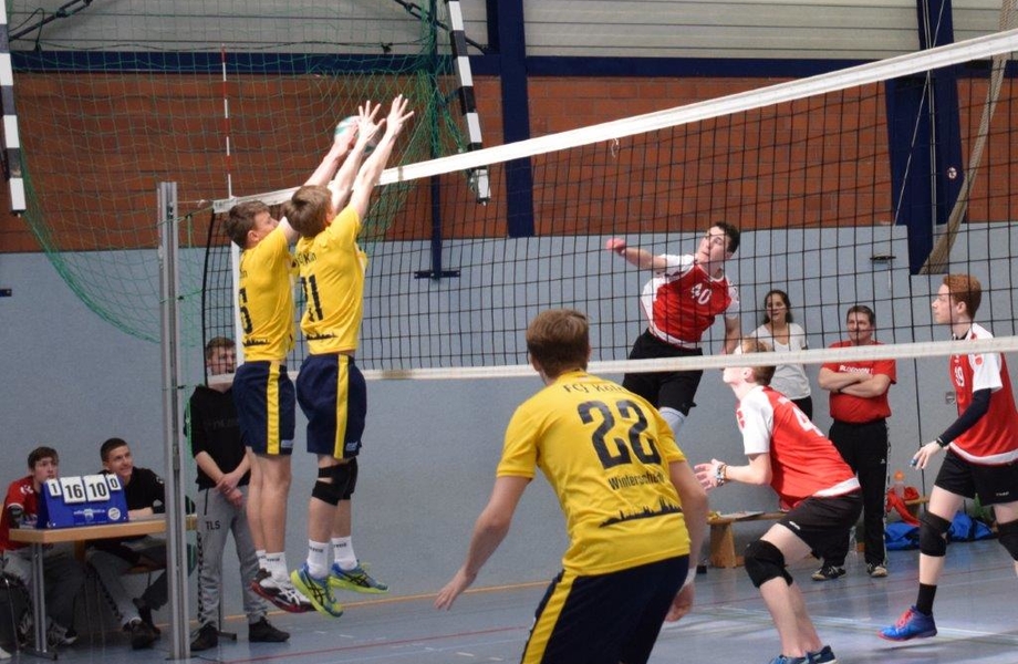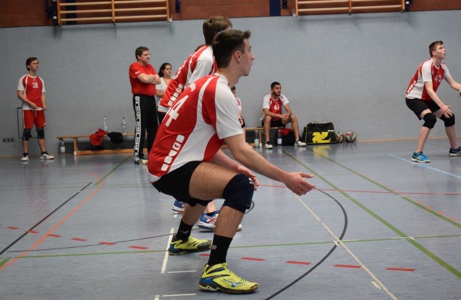 Der zweite Tag begann mit der Partie gegen PTSV Aachen, die sich überraschend als Oberliga-Dritter in den beiden folgenden Qualirunden durchgesetzt hatten und nun ebenso wie der TBH als Außenseiter an der Endrunde teilnehmen durften. Es wurde zwei Sätze lang eine enge und zähe Angelegenheit in der Schönspielen kaum eine Rolle spielte. Da sich Mo zudem am Morgen verletzt abgemeldet hatte, war der Kader auf acht Spieler geschrumpft und das Team stellte sich quasi von alleine auf. Einmal mehr erwischten die Höntroper Jungs an diesem Wochenende keinen guten Start, aber nach dem 3:10 und 10:17 kam die Mannschaft noch einmal heran, unterlag dann aber doch mit 22:25. Den Schwung nahm das team mit in den zweiten Durchgang und konnte sich so einen ordentlichen Vorsprung von bis zu vier Punkten herausspielen. Am Ende wurde es dann noch einmal kanpp, aber nach dem ersehnten ersten Satzgewinn mit 25:23 ging es immerhin in den Tie-Break. nach ausgeglichenem Beginn (4:3) folgte aber ein Einbruch, der zum 4:8 führte. Noch einmal kam die Mannschaft wieder heran (7:8), aber der nchste Einbruch zum 7:13 war dann letztlich zu viel. Am Ende ging der Satz und somit das Spiel mit 8:15 an die Aachener.