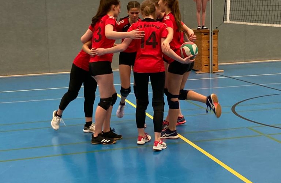 Im ersten Spiel gegen Schwelm sollten die zuvor ausgeguckten Lücken des Gegners angespielt werden. Dies klappte zu Beginn des Spiels überhaupt nicht, generell hatte man fast das Gefühl, dass die Mädels eher vor dem Ball wegliefen als hinzugehen. Es wurde nur verhalten angefeuert, leicht herumgealbert und auf dem Feld herrschte Unsicherheit, weshalb wir von Anfang an den Schwelmern hinterherliefen. Erst gegen Mitte des ersten Satzes wurde es besser und mutiger und das Team konnte sich langsam zurückkämpfen. Besonders Melina B. konnte hier mit guten Aufschlägen einige Punkte wieder gut machen. Am Ende wurde es dann nochmal sehr knapp, aber es reichte nicht ganz und so ging der erste Satz mit 23:25 an Schwelm. Im zweiten Satz sollte nun von Anfang an richtig gespielt werden und dieses Mal funktionierte es auch. Celina übernahm als Libero nun die Verantwortung und auch Lina konnte über die Außenposition Ruhe ins Spiel bringen. Die Unsicherheit zu Beginn war vergessen und das Team zeigte vor allem über Diagonal sehr effektive Angriffe. Mit einem 25:16 Endergebnis konnten die Mädels dieses Mal sehr zufrieden sein. In den dritten und entscheidenen Satz wurde erstmals wirklich laut gestartet und die Spielerinnen auf dem Feld konnten die vielen langen Ballwechsel meistens für sich entscheiden. Mit einigen guten Aufschlägen von Lina und Melina ging der dritte Satz an Höntrop.